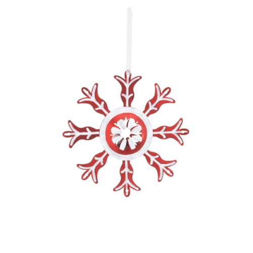 These classically-shaped snowflake ornaments are accented in white and include a cut-out center with a bell feature
