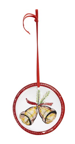 Hang this lovely Christmas Bells ornament on your tree, window, or even around your neck in a festive holiday spirit. The thin glass disk is hand-painted with golden bells, evergreen sprigs, and a delicate red-and-white rim, with a hole for the attached red ribbon. Images from nature are often found on the glass pieces by the designer, Olle Brozén, who studied glassblowing in Japan and is an avid gardener and naturalist. Kosta Boda has released this 2-3/4-inch, undated ornament as a limited edition, along with a matching glass platter also featuring Brozén's design. Both come gift-boxed.