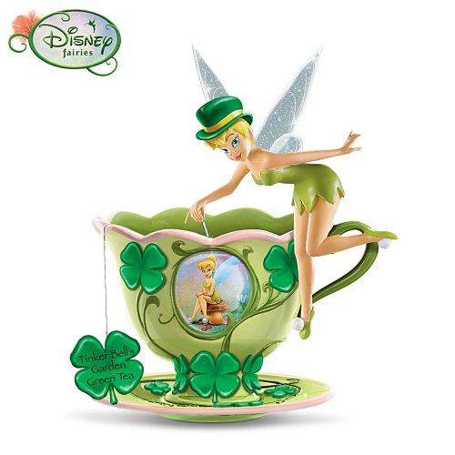 - Sculptural Tinker Bell wears a green and gold colored bowler hat and appears to float over the shamrock-covered teacup